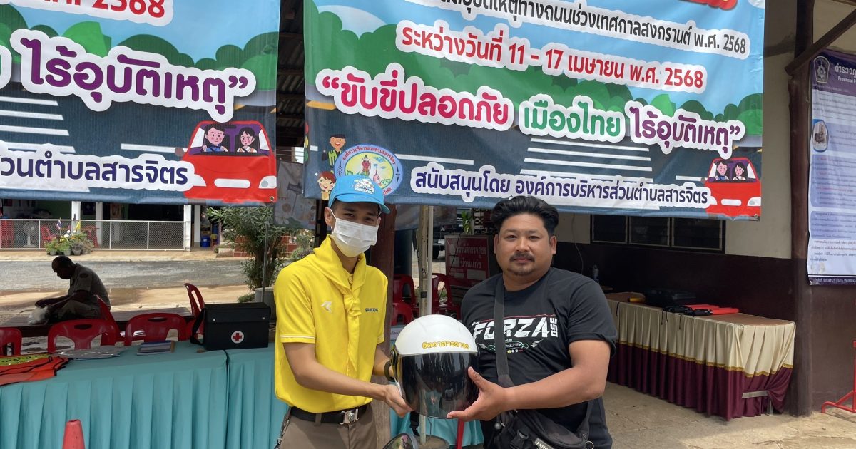 วันที่ 16 เมษายน 2568 เวลา 10.00 น. ภายใต้การอำนวยการของ พ.ต.อ.วรวิทย์ คชไกร ผกก.สภ.บ้านแก่ง มอบหมายให้ พ.ต.ต.สมนึก ช่างเก่ง สว.อก.สภ.บ้านแก่ง พร้อมด้วยข้าราชการตำรวจจิตอาสา รวมจำนวน 5 คน เพื่อจัดกิจกรรมจิตอาสาแจกหมวกนิรภัย ตามโครงการ ” จิตอาสาจราจร รณรงค์การขับขี่ปลอดภัยสวมหมวกนิรภัย เพื่อลดอุบัติเหตุทางบก ในช่วงเทศกาลสงกรานต์ ปี 2568 ” ณ ศูนย์จราจรสี่แยกสารจิตร ม.12 ต.สารจิตร อ.ศรีสัชนาลัย จ.สุโขทัย